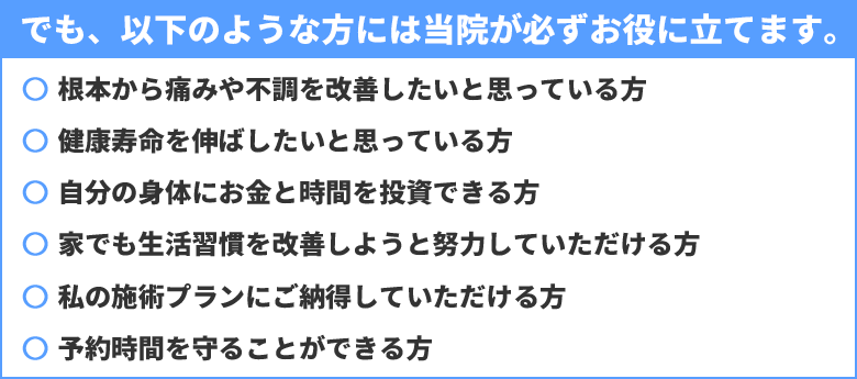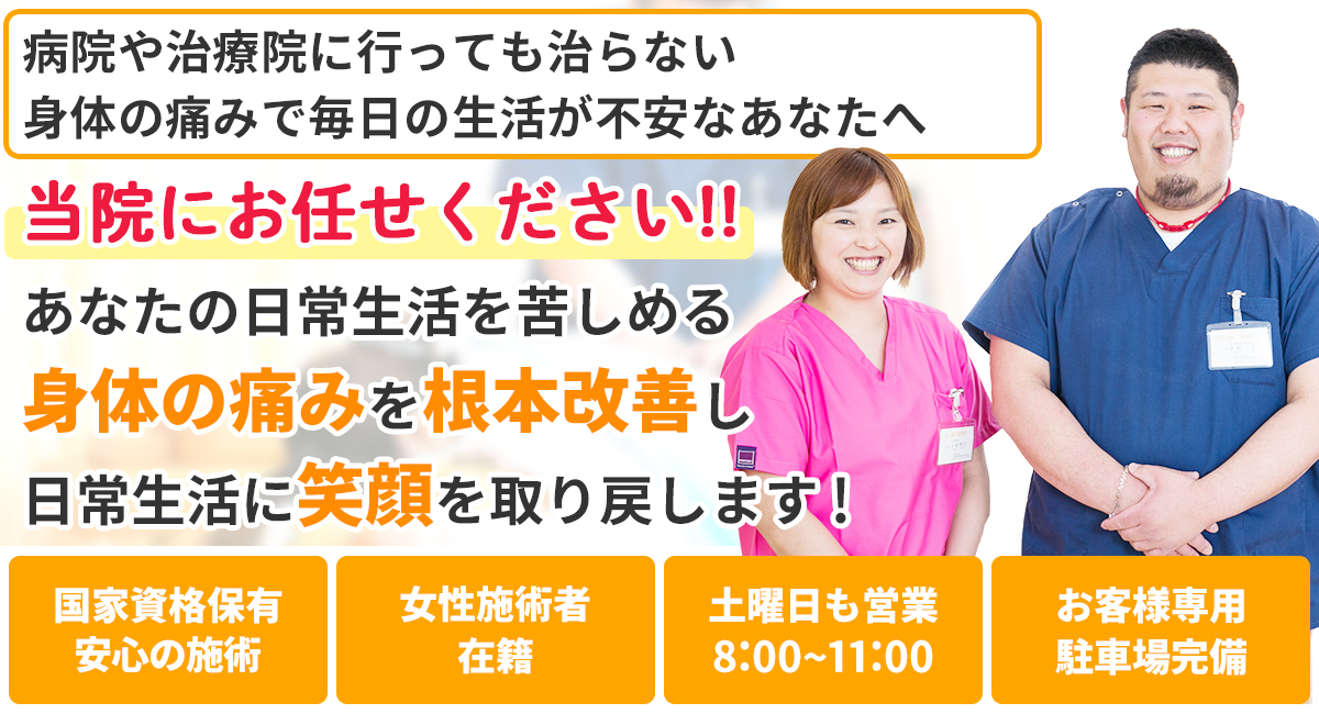 そのため、あなたの症状にあった、当院独自の施術をさせていただき、根本から改善いたします。
