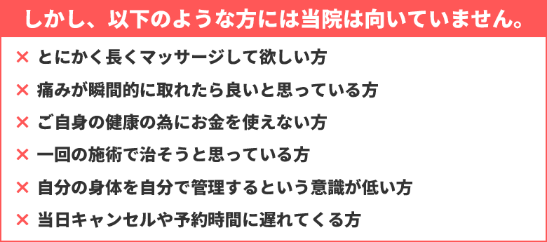 ただし、早期改善のためにもご提案させていただいた施術プランに則って通院いただくことをお勧めします。