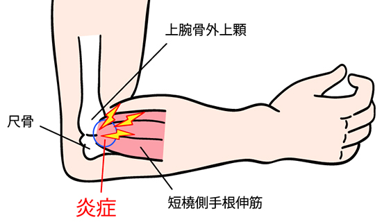 手首を伸ばす働きを担う「短橈側手根伸筋」という筋肉で炎症が起こり、肘関節に痛みが現れます。