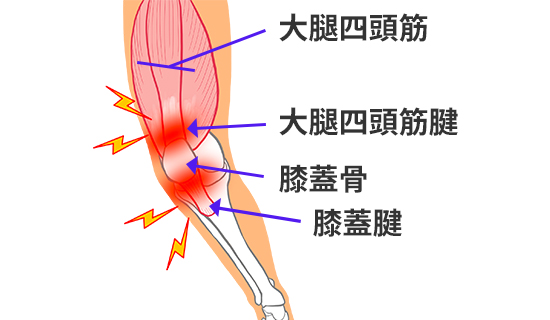 ジャンパー膝(膝蓋腱炎/大腿四頭筋腱付着部炎)とは、膝蓋腱や大腿四頭筋腱の炎症で痛みを発症します。