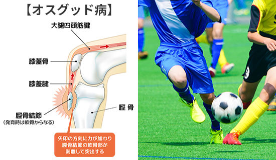 多くは、バレーボールやバスケットボールなどジャンプ動作を長時間繰り返したり、サッカーのキック動作やダッシュなど走る動作を繰り返したりするなど、膝の屈伸動作を頻繁にかつ長時間にわたって行う場合、膝の伸びる仕組みに過度なけん引力が繰り返し加わることで引き起こすスポーツ障害です。