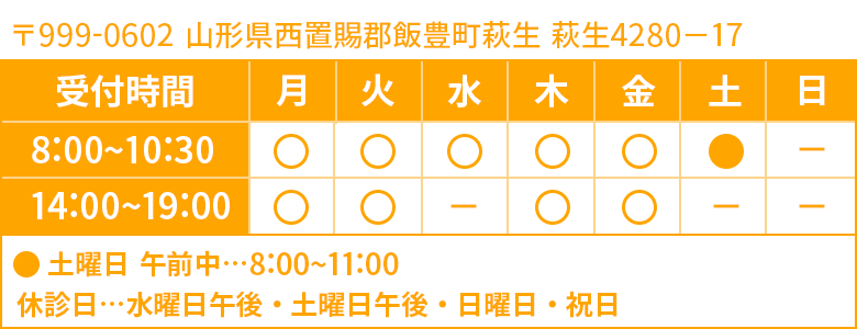 | 営業時間 | 【平日】8:00~10:30/14:00~19:00 【土曜日】8:00~11:00 |