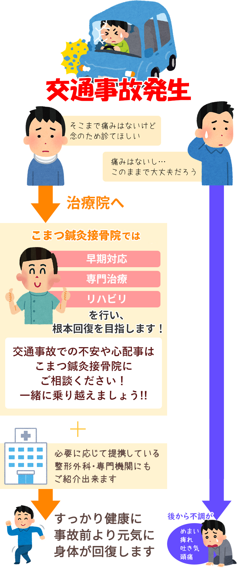 こまつ鍼灸接骨院では、正しい状態を維持できるように全身骨格矯正・筋肉調整で交通事故の後遺症が残らないような予防治療を行い、リハビリで本来の動きを取り戻す施術を行っています。